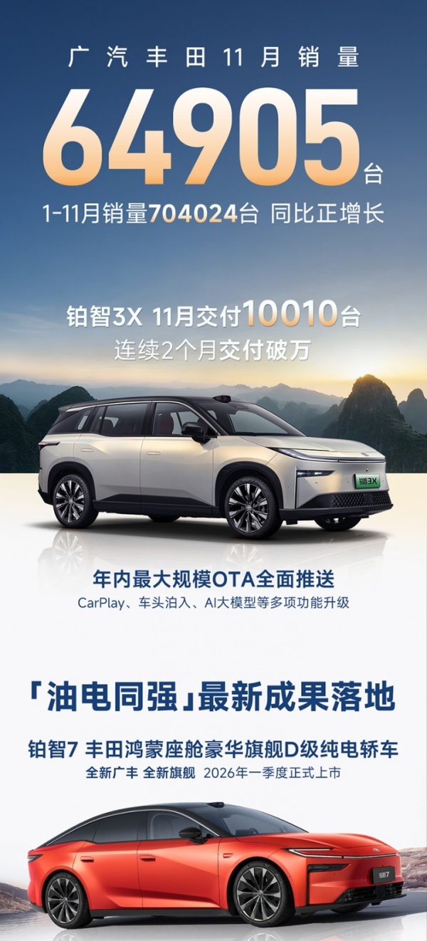近日,广汽丰田公布2025年11月汽车销量情况,11月整体销量64905台,全能累计销量704024台,同比正增长。其中11月铂智3X销量10010台,销量再次过万。另外,铂智7将明年一季度上市,目前已经开启盲订。