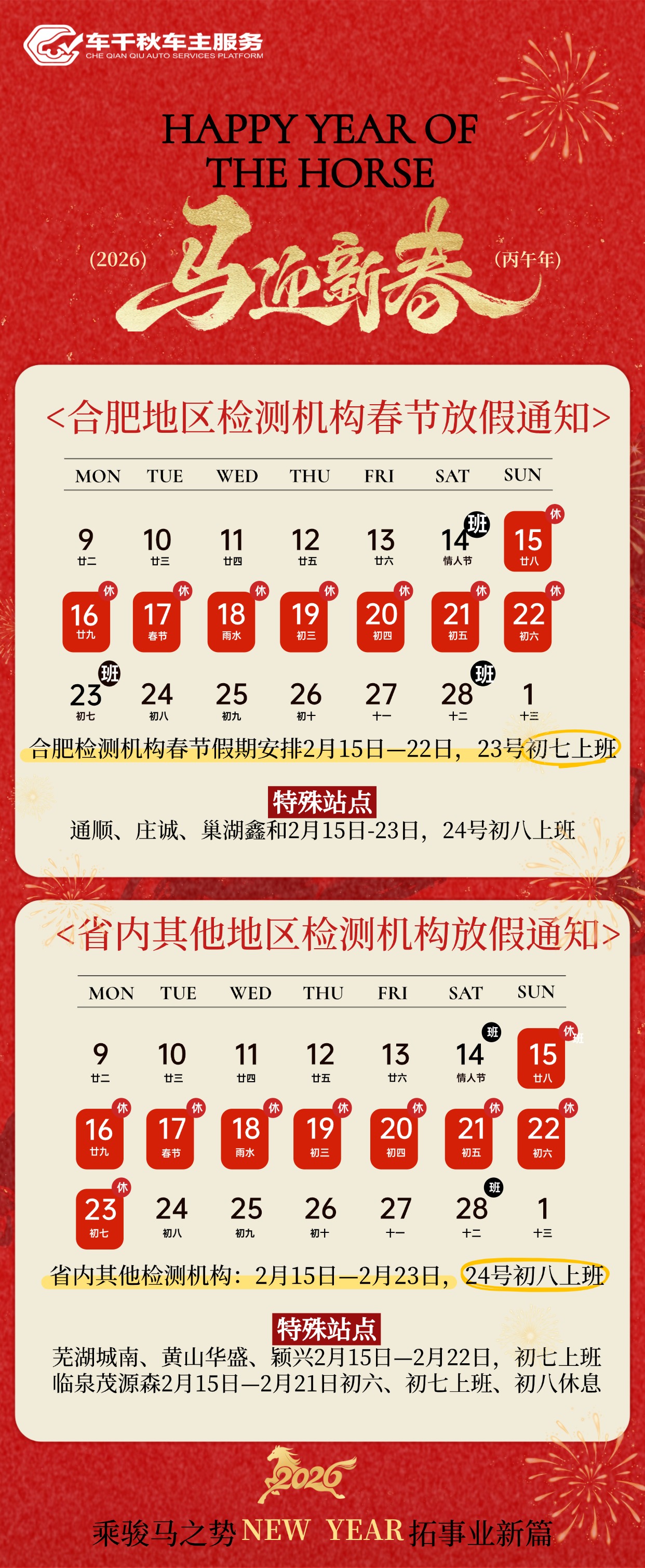 特殊站点通顺、庄诚、巢湖鑫和2月15日-23日,24号初八上班